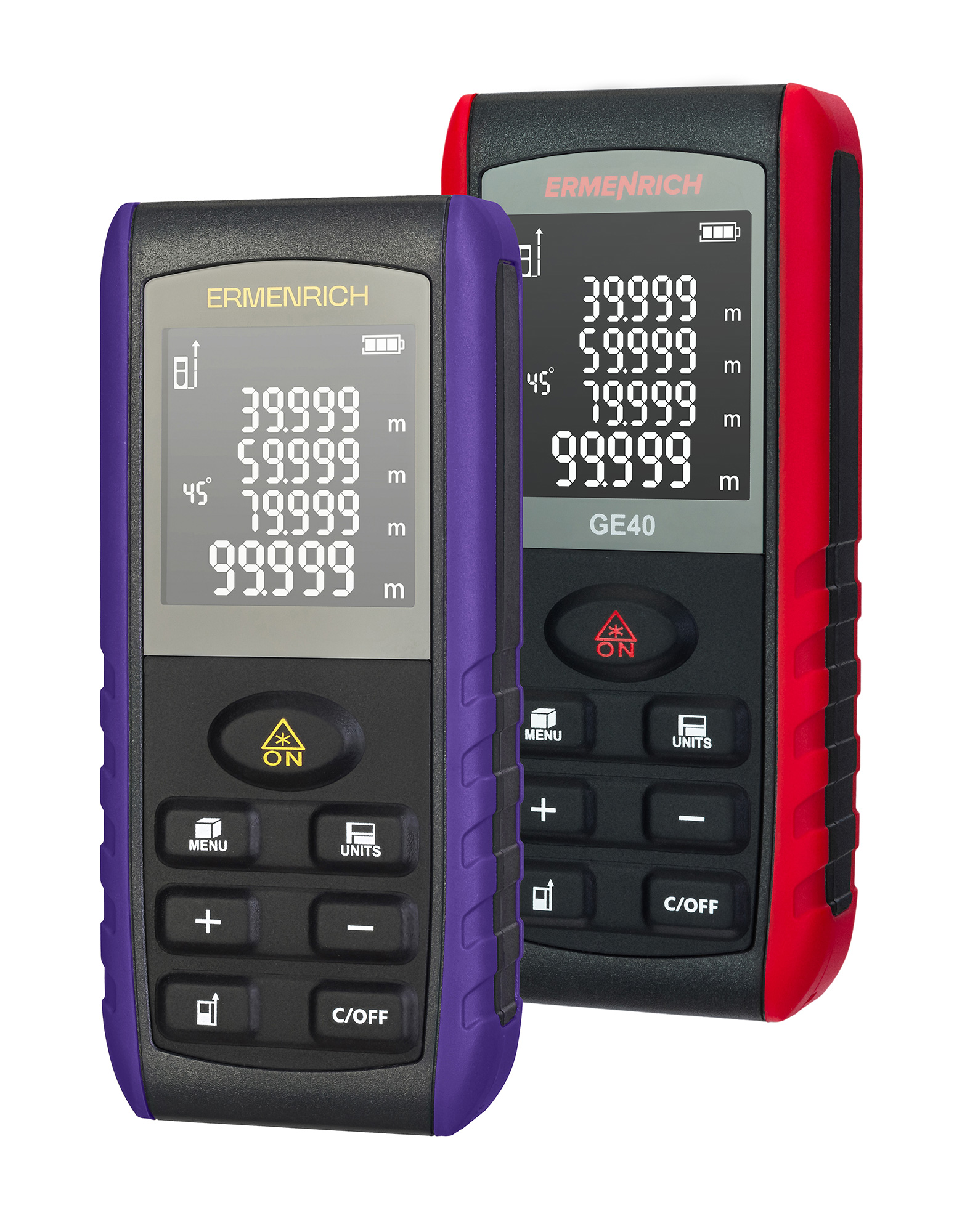 Лазерният измерител Ermenrich Reel PRO GE40 е практичен, многофункционален инструмент за строителни, ремонтни, монтажни и проектно-конструкторски работи. С него могат да се измерва разстояния до 40 метра, както и да се изчисляват площ, обем и ъгли. Когато трябва да се извършват измервания при трудни условия, функцията с използване на Питагоровата теорема ще Ви помогне да изчислите разстоянието с помощта на междинни измервания.
